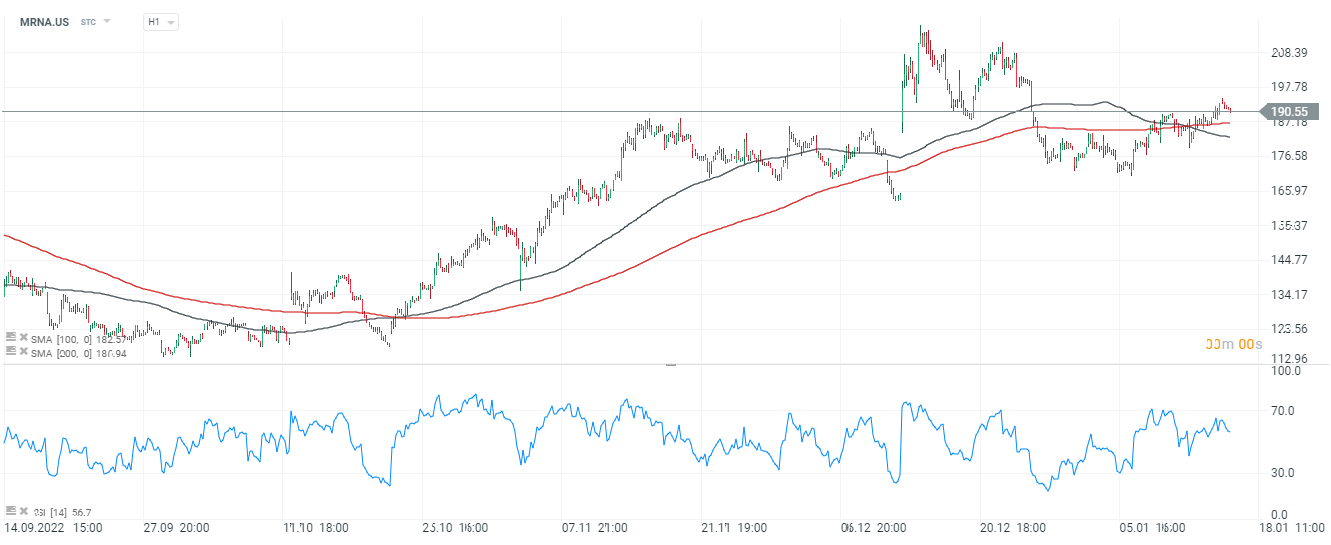 Akcje Moderny (MRNA.US), interwał H1. Źródło: xStation5