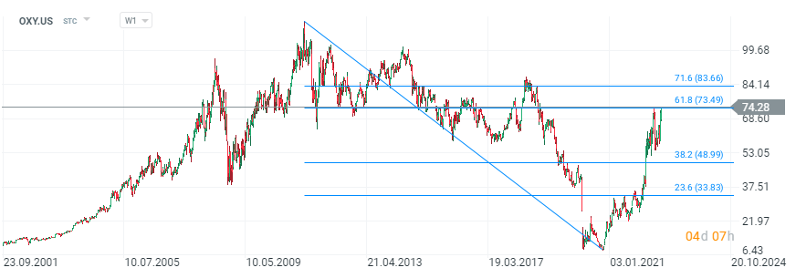 Wykres akcji Occidental Petroleum (OXY.US), interwał D1. Cena akcji wzrosła o ponad 130% od początku 2022 roku. Wzrosty wyhamowały jednak w okolicach 74 USD co zbiega się ze szczytami z pierwszej połowy roku oraz zniesieniem 61.8 wg. Fibonacciego. Źródło: xStation5