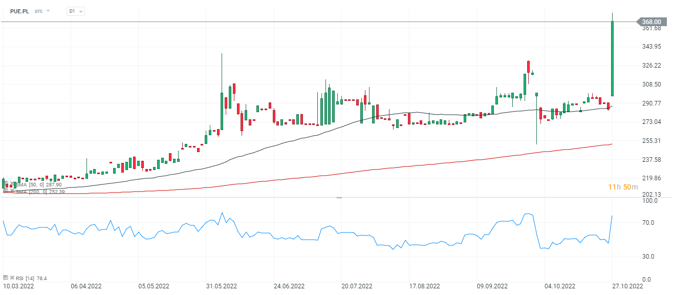 Akcje ZPUE (PUE.PL), interwał D1. Akcje zyskują blisko 30%. RSI wzbija się w okolice 80 punktów sygnalizując poziom wykupienia. Źródło: xStation5