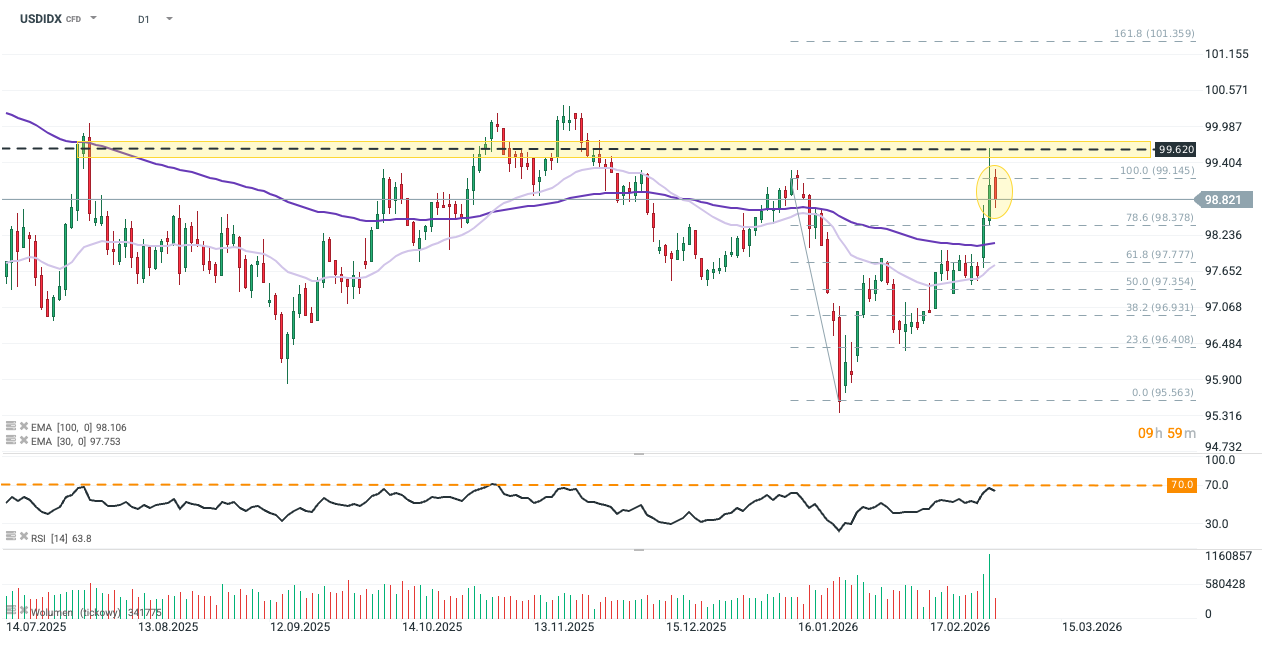 Obok efektu “ucieczki do bezpiecznych przystani”, siła dolara wynikała z gwałtownego wzrostu obaw o globalny skok inflacji, co sprzyja utrzymywaniu wyższych stóp procentowych w USA. Przedstawiciele Fed komunikowali coraz bardziej jastrzębie nastroje jeszcze przed powrotem inflacji PCE do 3%, dlatego dodatkowy szok naftowy przełożył się na gwałtowne odbicie rentowności obligacji w USA oraz spadek już chwiejnych oczekiwań wobec obniżek stóp procentowych na 2026 rok. Niemniej biorąc pod uwagę skalę ostatnich wzrostów oraz brak perspektyw na deeskalację konfliktu, obserwowana dzisiaj korekta może być jedynie techniczna i nie oznaczać końca presji wzrostowej na dolarze.