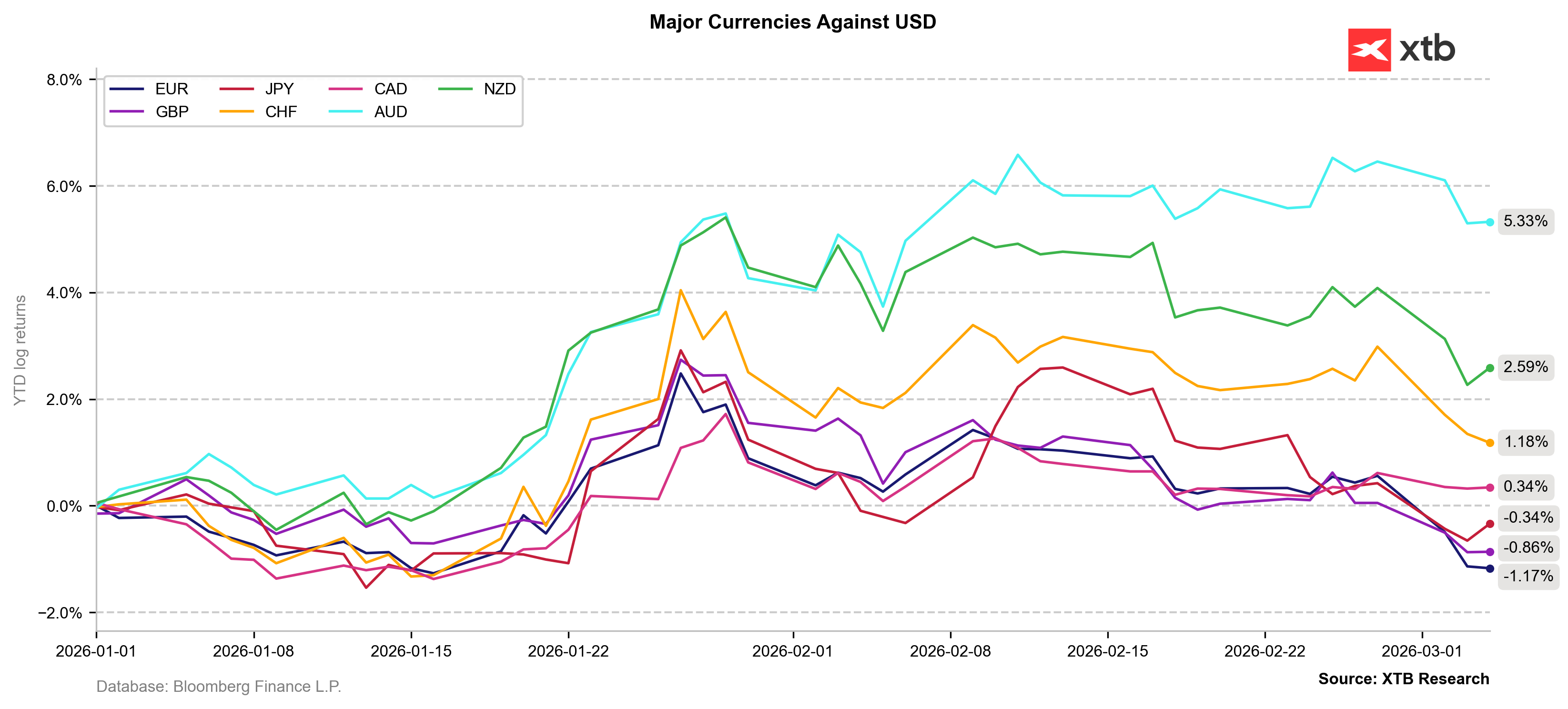 Nowe obawy o inflację mają charakter globalny, jednak połączony efekt “inflacja + ucieczka do bezpiecznych przystani” zawróciły notowania większości walut G10 względem dolara. Silną korektę odnotował nawet frank szwajcarski. Najbardziej ucierpiało EURUSD, które traci ok 1,2% YTD. Źródło: XTB Research