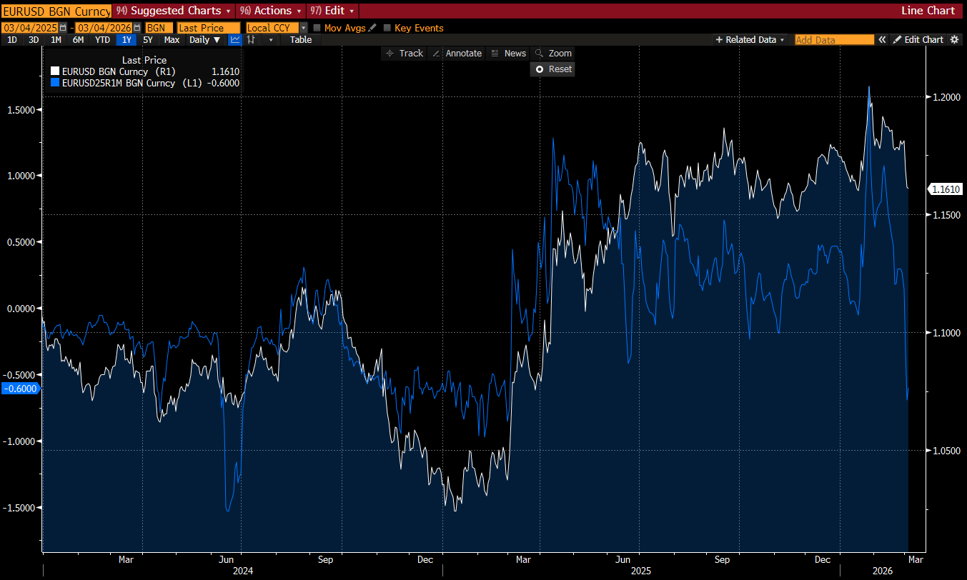 Kurs EURUSD (biały) vs implikowany przez rynek opcji Risk Reversal na okres 1 miesiąca (niebieski, negatywny). Źródło: Bloomberg Finance LP