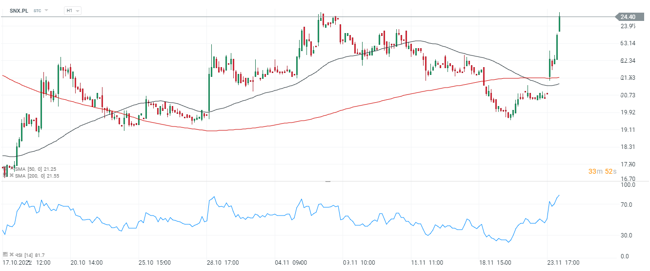 Akcje Sunex (SNX.PL), interwał H1. Cena akcji dotarła do lokalnego oporu w okolicach 25 PLN za walor, skąd może nastąpić korekta. Wskaźnik RSI pokazuje ponad 80 punktów sygnalizując wykupienie. Źródło: xStation5