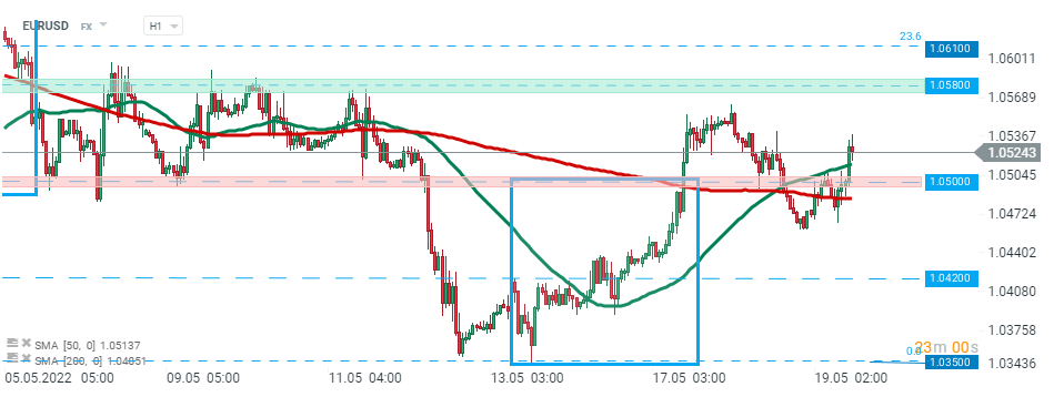 EURUSD odnotował stosunkowo niewielką reakcję na publikację protokołu EBC. Najpopularniejsza para walutowa kontynuowała handel w okolicach poziomu 1,0525. Źródło: xStation5