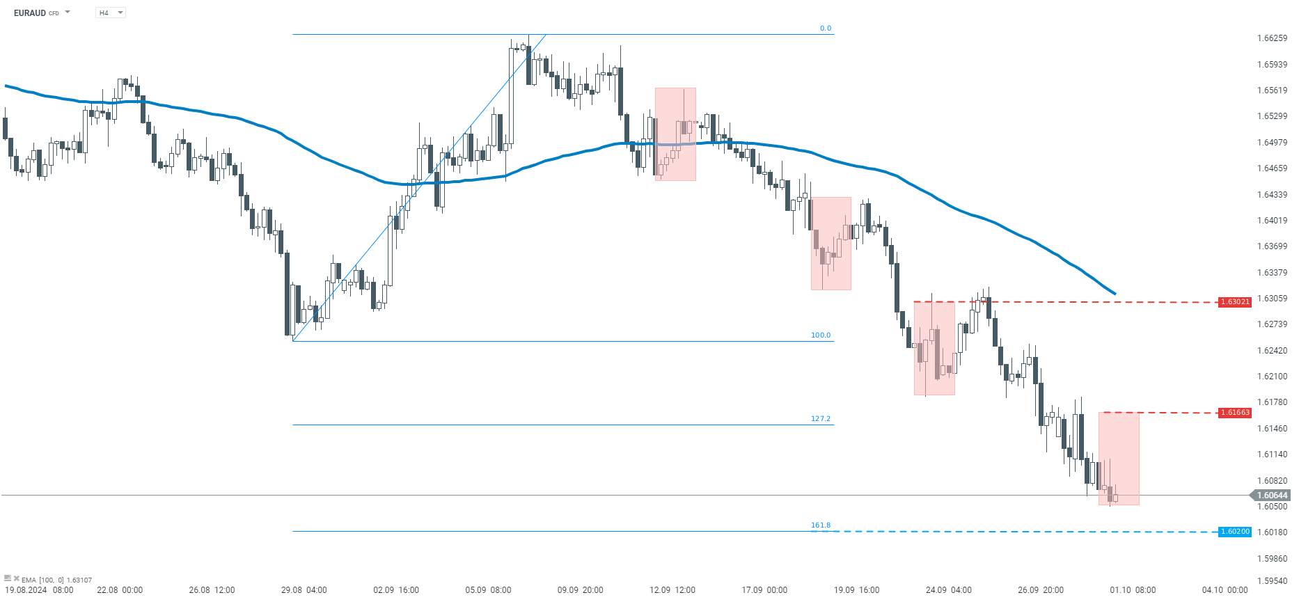Notowania EURAUD niemal od miesiąca znajdują się w silnej tendencji spadkowej. Patrząc na interwał D1. Cena od dłuższego czasu utrzymuje się poniżej średniej EMA100, a korekty są stosunkowo płytkie w porównaniu do impulsów. Zgodnie z założeniami klasycznej analizy technicznej oraz metodologii Overbalance obowiązuje sentyment spadkowy. Jako najbliższe ważne wsparcie traktujemy poziom 1.6020, który wynika z mierzenia 161,8% fibonacciego. Z kolei w przypadku korekty, oporem jest górne ograniczenie układu 1:1 przy 1.6166.