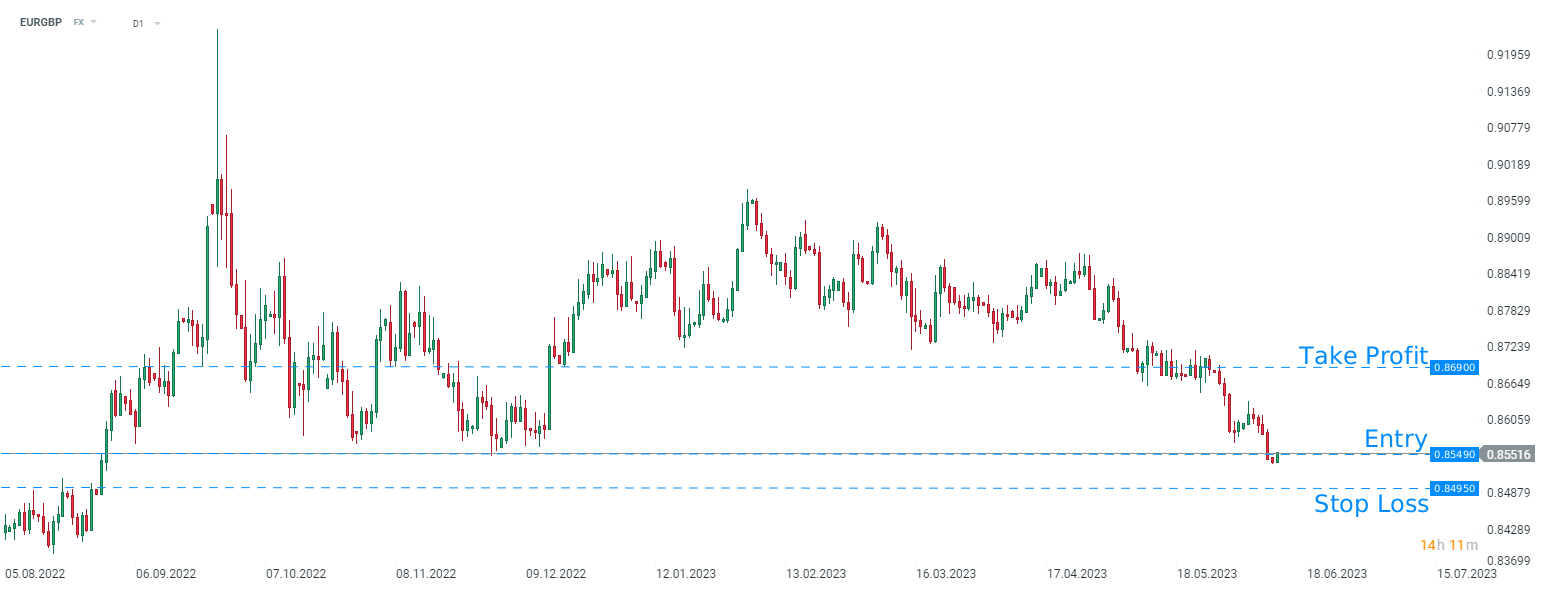 IFR zaleca zajęcie długiej pozycji na parze EURGBP po aktualnej cenie rynkowej, z celem docelowym wynoszącym 0,8690 i zleceniem stop loss umieszczonym na poziomie 0,8495. Źródło: xStation 5