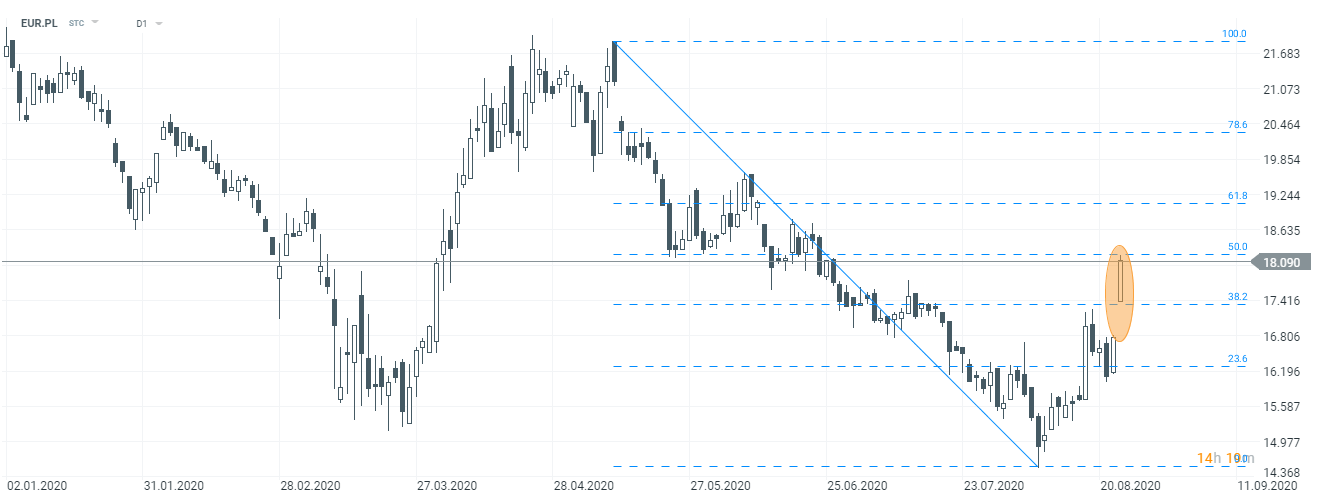 Mocne wyniki za Q2’20 wspierają dzisiejsze notowania Eurocashu (EUR.PL). Po gwałtownym odbiciu z marcowego dołka i osiągnięciu lokalnego maksimum, w okresie maj-sierpień walory znajdowały się w trendzie spadkowym. W pierwszej połowie sierpnia doszło jednak do poprawy nastrojów wśród inwestorów i znów mamy do czynienia ze stopniowym ruchem w górę. Dzisiejsza luka wzrostowa sięgnęła tym samym zniesienia 50% fali spadkowej zapoczątkowanej 12 maja. Źródło: xStation5