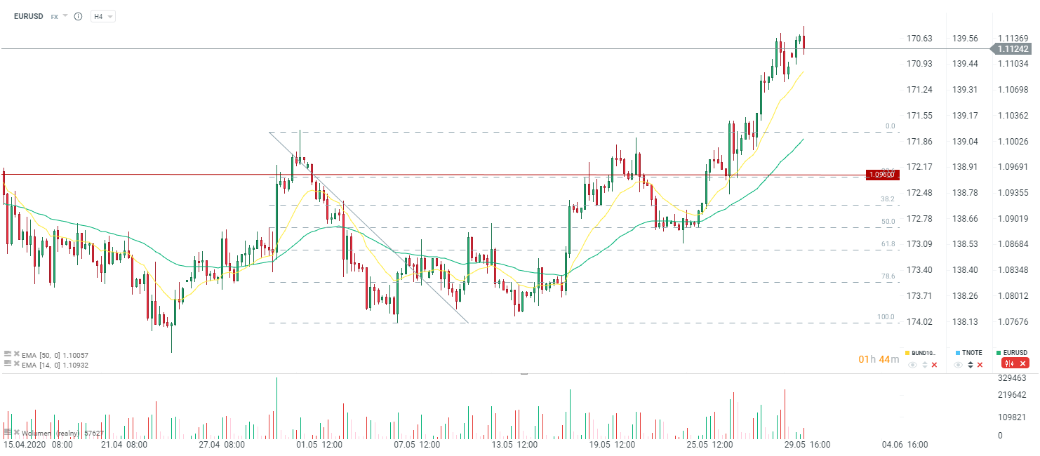 Indeks PMI dla przemysłu dla całej strefy euro wypada na poziomie 39,4 przy wstępnym odczycie na poziomie 39,5. Niemniej warto pamiętać, że jest to spore odbicie w porównaniu do kwietnia, kiedy to indeks wyniósł 33,4 punkty. Co ciekawe, zdecydowana większość krajów w EMU miała odczyty powyżej 40 punktów. Najlepiej w tym wszystkim wypadły Włochy z odczytem powyzej 45 punktów. Z drugiej strony Niemcy zaliczyły bardzo niewielkie odbicie w porównaniu do kwietnia z odczytem na poziomie 36,6. W Hiszpanii odczyt wyniósł 38,3.