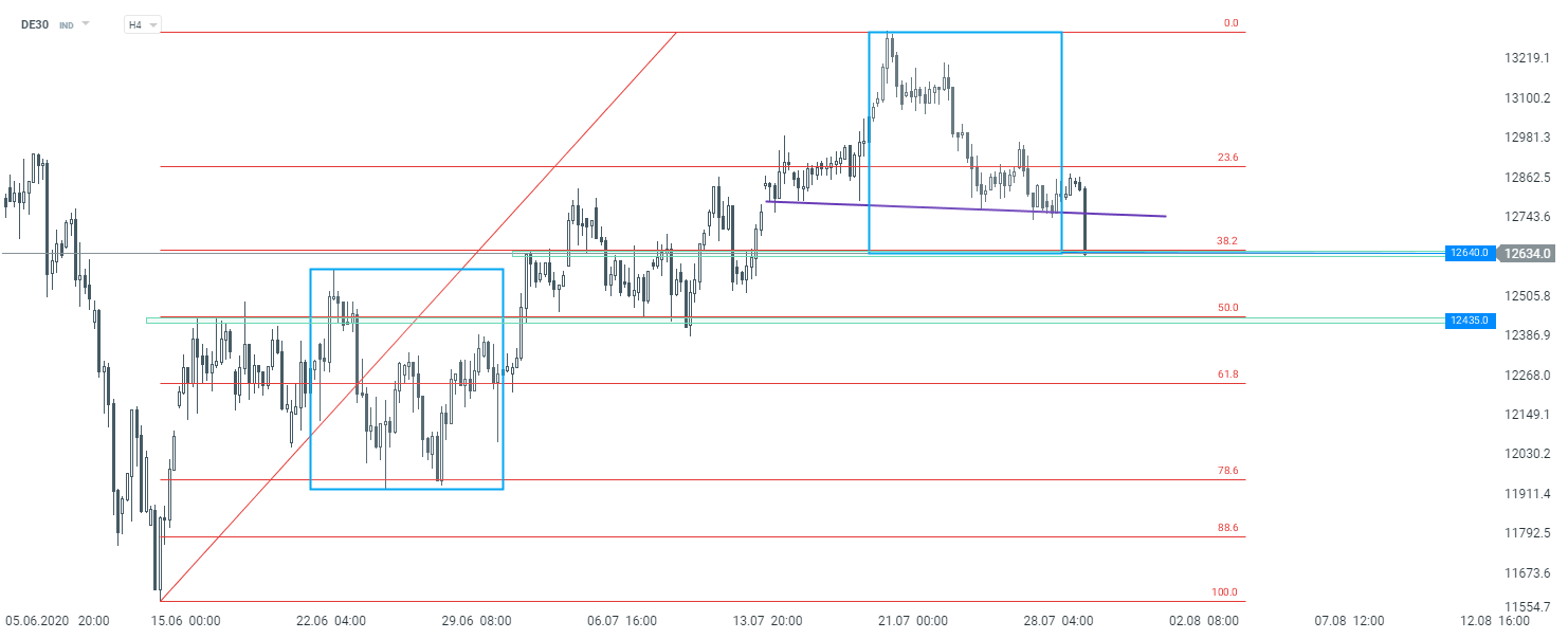 Na niemieckim indeksie widać realizującą się formację głowy z ramionami. Niemniej notowania dotarły aktualnie do wsparcia wynikającego z geometrii 1:1, która jest także potwierdzona mierzeniem 38,2%. Jednak dynamika spadków jest spora, jeśli poziom zostanie wybity, droga w kierunku 12 435 pkt zostanie otwarta.