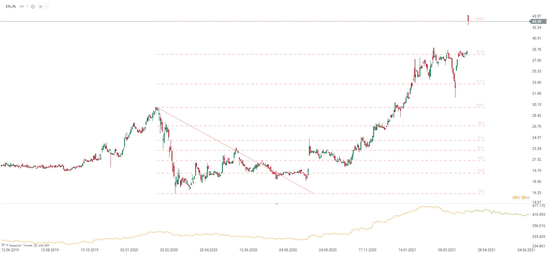 Niemniej sporo dzieje się na szerokim rynku. Dzisiaj mocno zyskuje spółka Eurotel (ETL.PL), która otwiera się powyżej zniesienia 200.0 cofnięcia związanego z początkiem pandemii. Warto zauważyć, że wcześniejszy opór w okolicach zniesienia 161.8 oznaczały poprzednie historyczne szczyty.