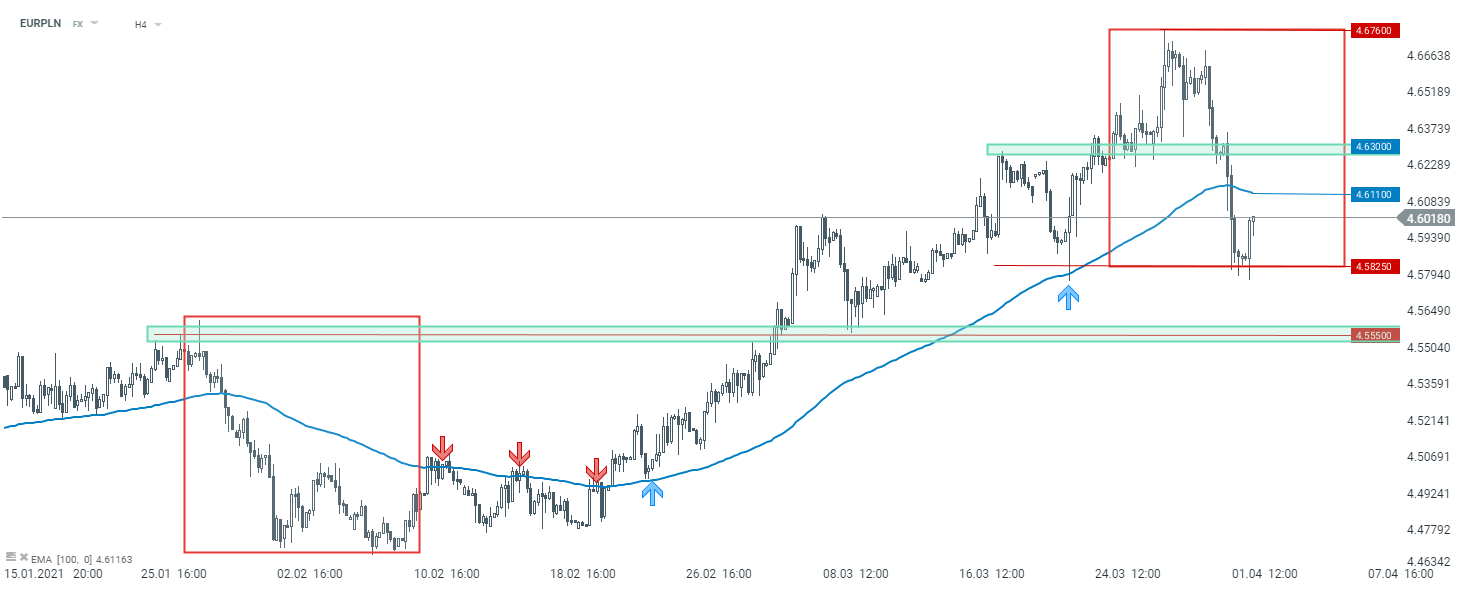 Patrząc na wykres dzienny, kupujący pojawili się na wysokości poziomu 4,5825 zł. Wsparcie wynika z układu geometrycznego - z dokładnie tego samego zasięgu ruchem spadkowym mieliśmy do czynienia na przełomie końcówki stycznia, początku lutego tego roku (czerwone prostokąty). Jeżeli kupujący zdołają utrzymać kierunek, możliwy jest atak na opór przy 4,6110 zł (wynikający ze średniemj EMA100), bądź nawet 4,63 zł (strefa wcześniejszej reakcji ceny). W przypadku gdyby jednak przy ponownym teście doszło do pokonania wsparcia przy 4,5825 zł, celem dla sprzedających może okazać się strefa przy 4,555 zł.