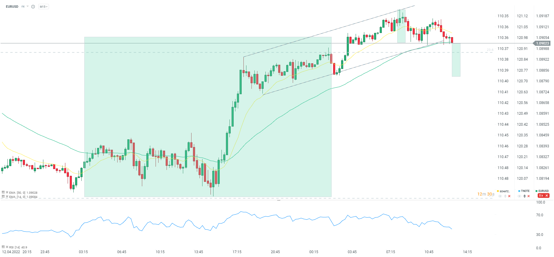 EURUSD zyskuje nieznacznie dzisiaj i próbuje bronić poziomu 1,0900. W tych okolicach mamy również 50 okresową średnią na M15 oraz dolne ograniczenie wzrostowego kanału. Jednocześnie jednak widzimy coś w postaci RGR, którego zasięg wskazuje na okolice poziomu 1,088.