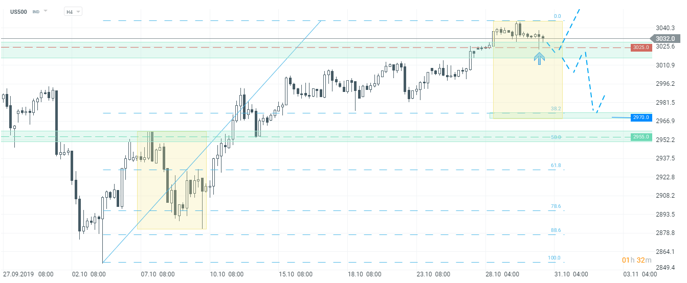 Na początku tygodnia US500 wybił górą strefę oporową przy 3025 pkt, i tym samym znalazł się na najwyższych poziomach w historii. Poziom ten był już dziś testowany od drugiej strony i jak na razie jest broniony. Analiza techniczna przemawia więc za dalszymi wzrostami, tak długo jak krus znajduje się powyżej poziomu 3025 pkt istniej szansa na dalszy ruch w górę. Z drugiej strony, przełamanie poziomu może doprowadzić do większej korekty spadkowej. Wtedy też należy wziąć pod uwagę dwa poziomy wsparcia, które wypadają dość blisko siebie. Pierwszy z nich znajduje się przy 2970 pkt i wynika z dolnego ograniczenia układu Overbalance. Z kolei 15 punktów niżej wypada mierzenie 50% Fibonacciego, które pokrywa się z wcześniejszą sekwencją wzrostową.