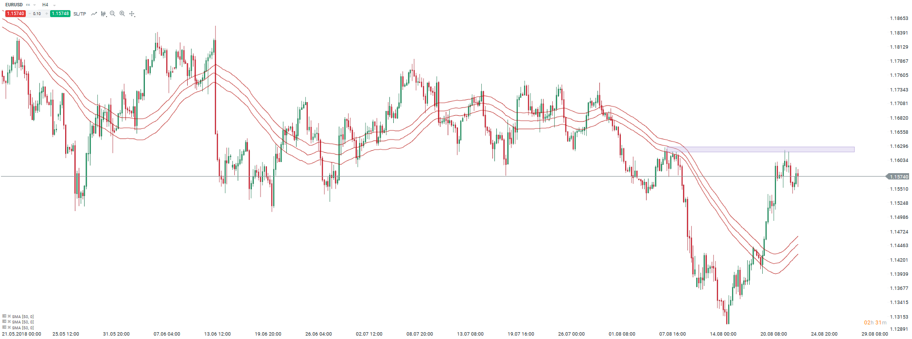Jak możemy zauważyć na wykresie ostatnie godziny nie przyniosły istotnych zmian, a dolar po opublikowanych wczoraj wieczorem minutes FED umacnia się. Najważniejszym oporem wydają się okolice 1,1625, gdzie zatrzymało się ostatnie odreagowanie oraz znajdują się maksima z 8 sierpnia. Biorąc pod uwagę kształt ostatnich wahań cen to można zauważyć potencjalną formację odwróconej głowy z ramionami(lewe ramie - maksima z 8 sierpnia, głowa - dołki z 15 sierpnia, prawe ramie - dzisiejsze minima). Jeżeli doszłoby do wybicia linii szyi to możliwe jest, że ostatnie wzrosty na tej parze mogły być nie tylko korektą, lecz początkiem trwalszej zmiany tendencji.
