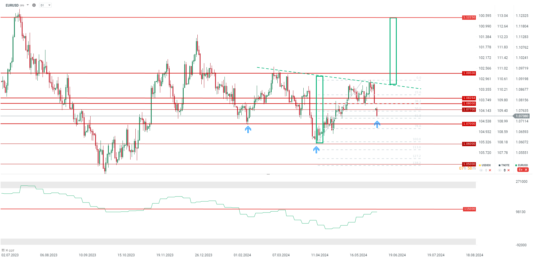 Warto jednak podkreślić, że wyniki wyborów do Parlamentu Europejskiego mają ograniczony wpływ na sytuację na euro, gdyż zwiększone poparcie dla partii skrajnie prawicowych i potencjalna zmiana kierunku w europejskiej polityce była oczekiwana. Wobec tego częściowa słabość euro była już wcześniej wyceniona. Zdecydowanie większe znaczenie dla euro ma niepewność dotycząca wyborów we Francji. Emanuel Macron, prezydent Francji zdecydował się na zwołanie przedterminowych wyborów, które mają odbyć się już 30 czerwca, a druga tura 7 lipca.