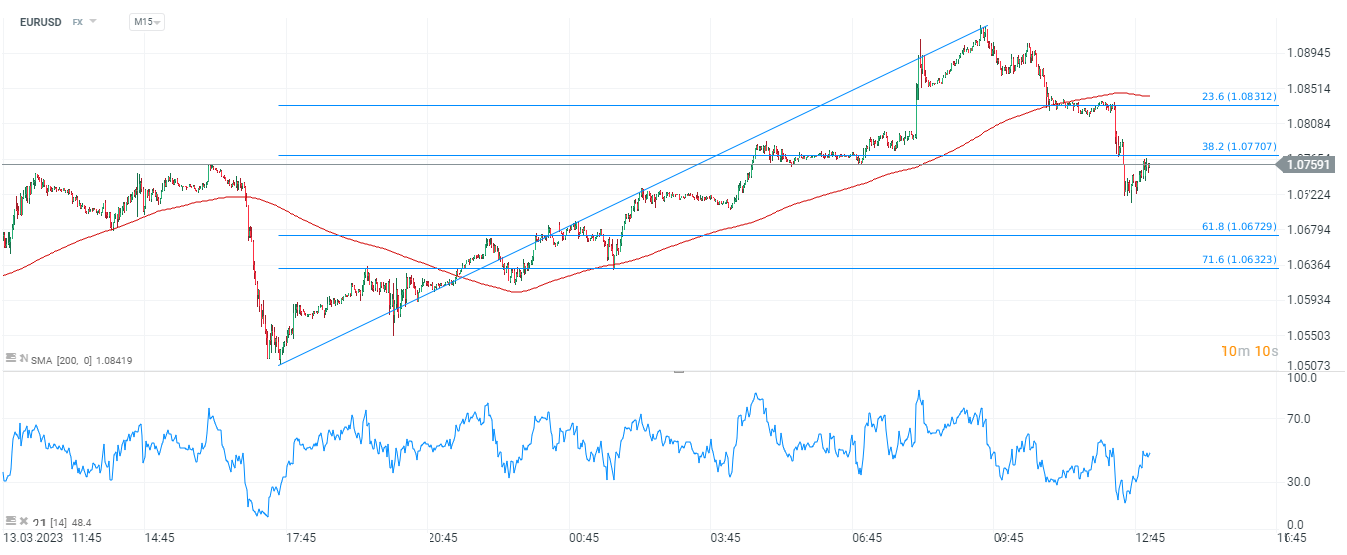 Wykres EURUSD, interwał M15. Dolar amerykański nieznacznie wzmocnił się w relacji do EUR po wypowiedziach Bullarda i lepszych danych PMI. Kluczowy dla bykow może okazać się poziom 1,077 przy 38,2 zniesieniu Fibonacciego fali wzrostowej zapoczątkowanej w połowie marca. Źródło: xStation5