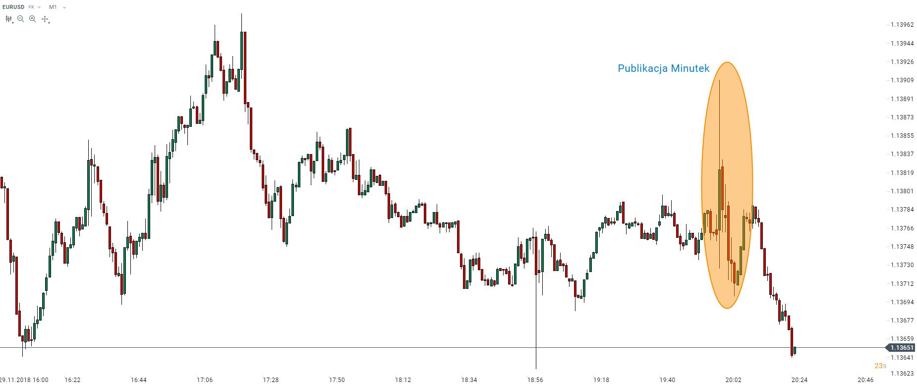Wydźwięk minutek FOMC był mieszany. Do jastrzębich wzmianek możemy z pewnością zaliczyć zdania mówiące o tym, że członkowie Komitetu byłi zgodni, co do kontynuowania stopniowego podnoszenia stóp procentowych. Niemniej jednak, wzmianka o możliwej zmianie retoryki odnoszącej się do przyszłych podwyżek może być odebrana jako próba zmiękczenia przekazu. Zdanie mówiące o tym, że większość członków Komitetu była zgodna co do potrzeby podwyżki w niedalekiej przyszłości mogła się odnosić do grudniowego posiedzenia, co byłoby neutralne mając na względzie, że ta podwyżka jest oczekiwana przez rynek. Wśród ryzyk nie znalazło się nic nowego, co by mogło w znaczący sposób pogorszyć sentyment na rynkach. Jak to często bywa przy publikacjach tej rangi EURUSD podlegał dużej zmienności w pierwszych minutach po publikacji. Po początkowym silnym ruchu w góre przyszedł silny ruch w dół. W momencie kiedy para ponownie powróciła w okolice poziomów z przed publikacji rozpoczął się już mniej zdecydowany ruch spadkowy. Rynek ocenił dzisiejszą publikację jako pozytywną dla dolara wobec ostatnich wypowiedzi członków Rezerwy, które sugerowały możliwą potrzebę zwolnienia lub zatrzymania cyklu podwyżek.