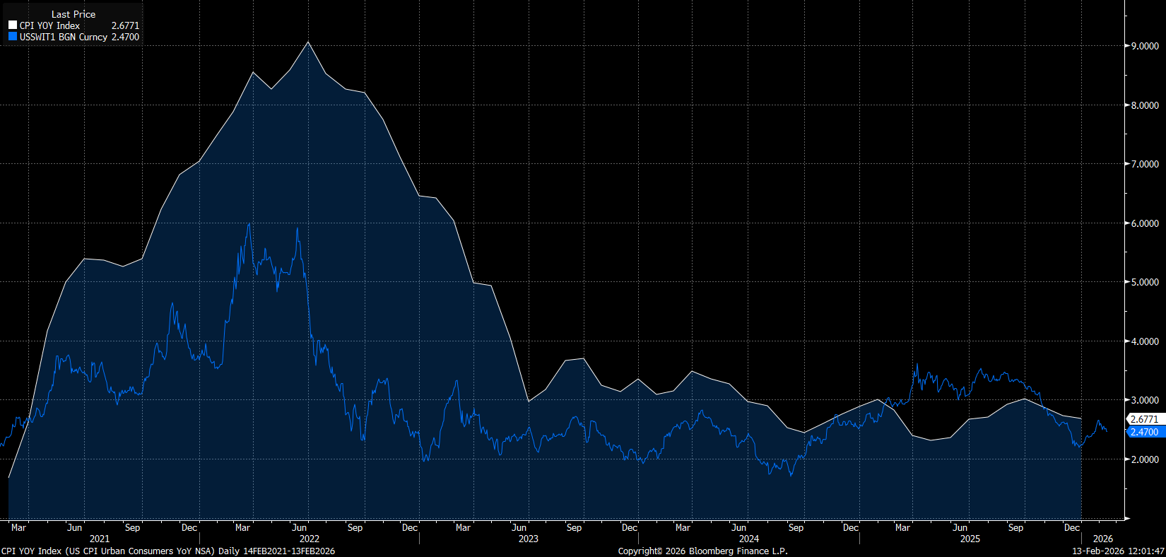 Konsensus na inflację CPI za styczeń zakłada spowolnienie inflacji ogółem do ok. 2,5% r/r z 2,7% w grudniu, przy miesięcznej dynamice 0,3% m/m, identycznej jak miesiąc wcześniej. Inflacja bazowa, czyli Core CPI ma pozostać relatywnie stabilna na poziomie 2,5% r/r wobec 2,6% i ma wzrosnąć o 0,3% m/m po wzroście na poziomie 0,2% w grudniu. Część instytucji (np. Goldman Sachs) jest nieco bardziej optymistyczna co do głównego odczytu, wskazując na spadek rocznej dynamiki do 2,4% r/r. Jednocześnie bank podkreśla presję z tytułu ceł w takich kategoriach jak odzież, rekreacja czy sprzęt domowy. Z drugiej strony, modele oparte na danych rynkowych (np. XTech Macro) wskazują nawet na 2,3% r/r dla głównego odczytu orazi 2,4% r/r w core, co miałoby oznacząc mocniejsze schłodzenie. Swap inflacyjny sugeruje z kolei, że inflacja miałaby wypaść blisko konsensusu w zakresie 2,5-2,6%, choć jednocześnie ten sam wskaźnik mówił o znacznie niżej inflacji za grudzień. Jeśli swap infacyjny miałby być minimalnie wyprzedzającym wskaźnikiem, można byłoby oczekiwać faktycznie zdecydowanie niższego wskaźnika, bazując na poziomach 2,2-2,3% notowanych w grudniu.