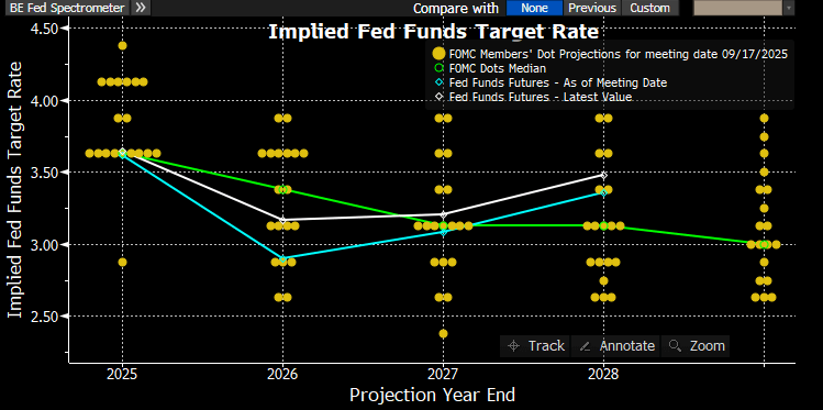 Na ten moment konsensus Fed wskazuje jedynie na jedną obniżkę stóp procentowych oraz rynek wskazuje na dwie obniżki. Sam wykres kropkowy pokazuje ogromny rozstrzał oczekiwań na 2026 oraz 2027 rok. Najprawdopodobniej najnowsze prognozy powinny być nieco bardziej spójne i otworzyć drogę do większej ilości obniżek w przyszłym roku niż jedna. Bloomberg Economics wskazuje na to, że stopy mogą być obniżone nawet o 100 punktów bazowych w przyszłym roku, co mogłoby być możliwe wraz z wyborem nowego bardziej gołębiego szefa Fed. Kolejna obniżka jest wyceniana na kwiecień lub czerwiec przyszłego roku, ale jeśli dane okażą się słabe, istnieje szansa, że obniżka pojawi się w marcu, a być może nawet w styczniu, co byłoby absolutnym ciosem dla dolara w dalszym terminie.