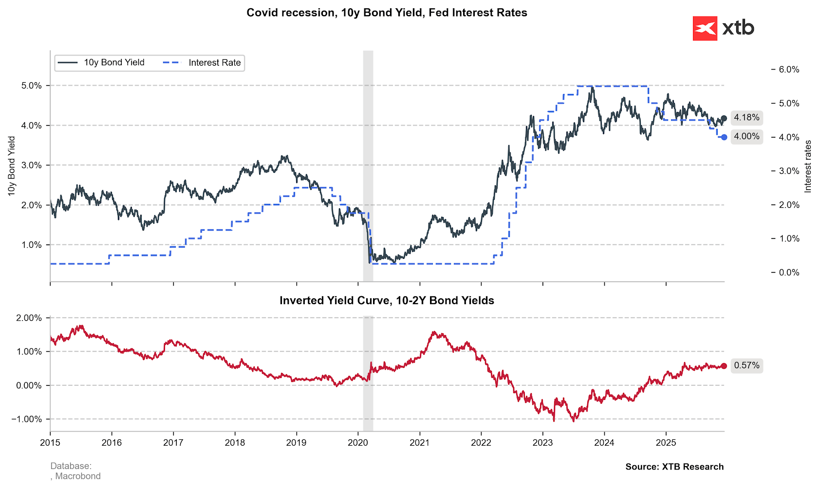 Fed ma obniżyć stopy procentowe, ale warto zauważyć, że rentowności 10 letnich obligacji pozostają na dosyć podwyższonym poziomie. Różnica między 10 i 2 letnimi obligacjami pozostaje stabilna niemal przez cały 2025 rok. Źródło: Bloomberg Finance LP, XTB