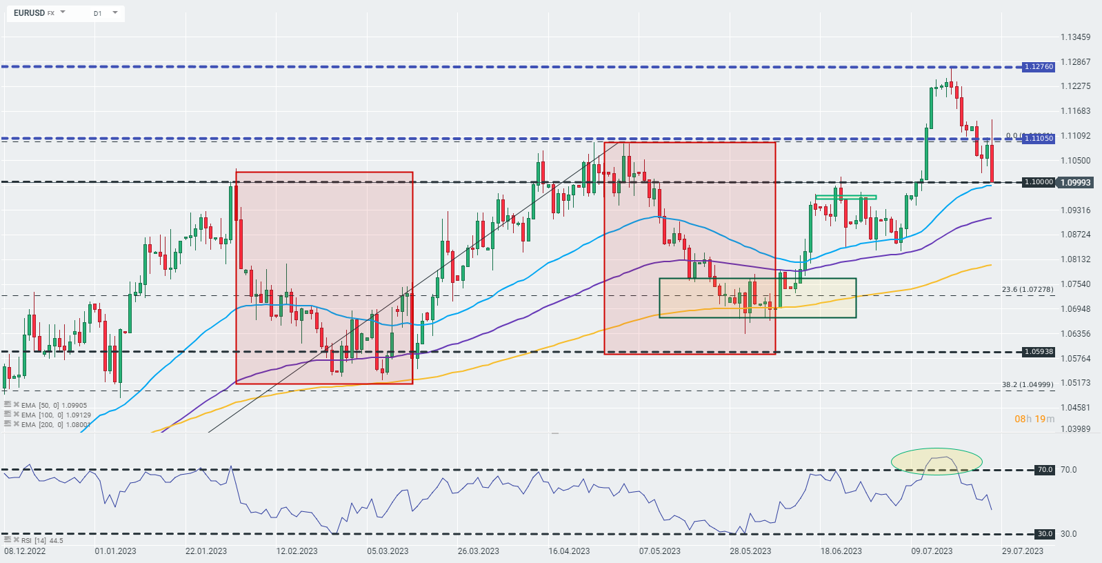 Para EURUSD wybija się poniżej psychologicznej bariery 1,1000 wobec bardzo dobrych danych z USA oraz gołębich komentarzy Prezes Lagarde. Źródło: xStation 5