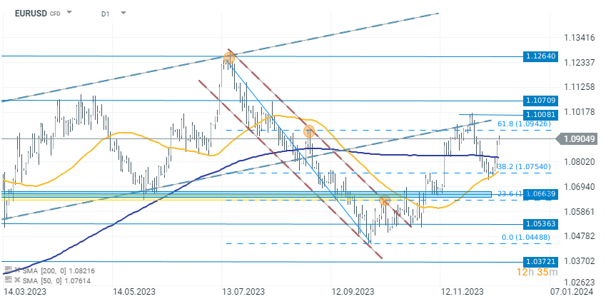Euro pozostaje jedną ze słabszych walut na rynku, gdyż oczekiwania wskazują na gołębi przekaz EBC. Jednocześnie dolar jest jeszcze słabszy, co pozwala na 0,3% wzrostu na parze EURUSD i wyjście powyżej poziomu 1,09. Inwestorzy reagują na bardziej wyraźny pivot banków centralnych, a spekulacje na rynkach obecnie są skupione wokół perspektywy pierwszych obniżek stóp procentowych. Co jest równie ważne, EURUSD zyskuje już prawie 1,40% w ciągu 3 sesji, zbliżając się ponownie do kluczowego poziomu 1,100.
