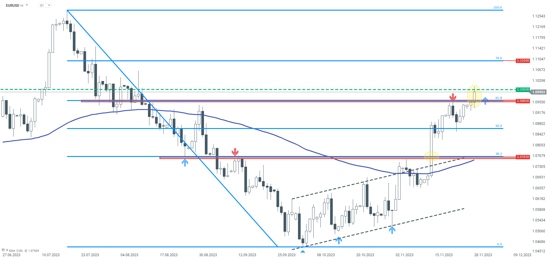 Notowania EURUSD po raz pierwszy od połowy sierpnia tego roku wspięły się powyżej okrągłego poziomu 1,1000. Patrząc na sytuację techniczną, od początku października przeważa sentyment wzrostowy. Ruch w górę przybrał na sile 14 listopada kiedy ukazały się dane o inflacji CPI z USA wskazujące na szybszy spadek wzrostu cen. Następnie ruch w górę był kontynuowany, a sprzedający pojawili się dopiero na wysokości oporu przy poziomie 1,0960, który wynika z mierzenia 61,8% Fibonacciego całej ostatniej fali spadkowej, licząc od maksimum z lipca. Przebicie wskazywanego oporu na dzisiejszej sesji może otwierać drogę nawet w kierunku kolejnego zniesienia Fibo - przy poziomie 1,1100.