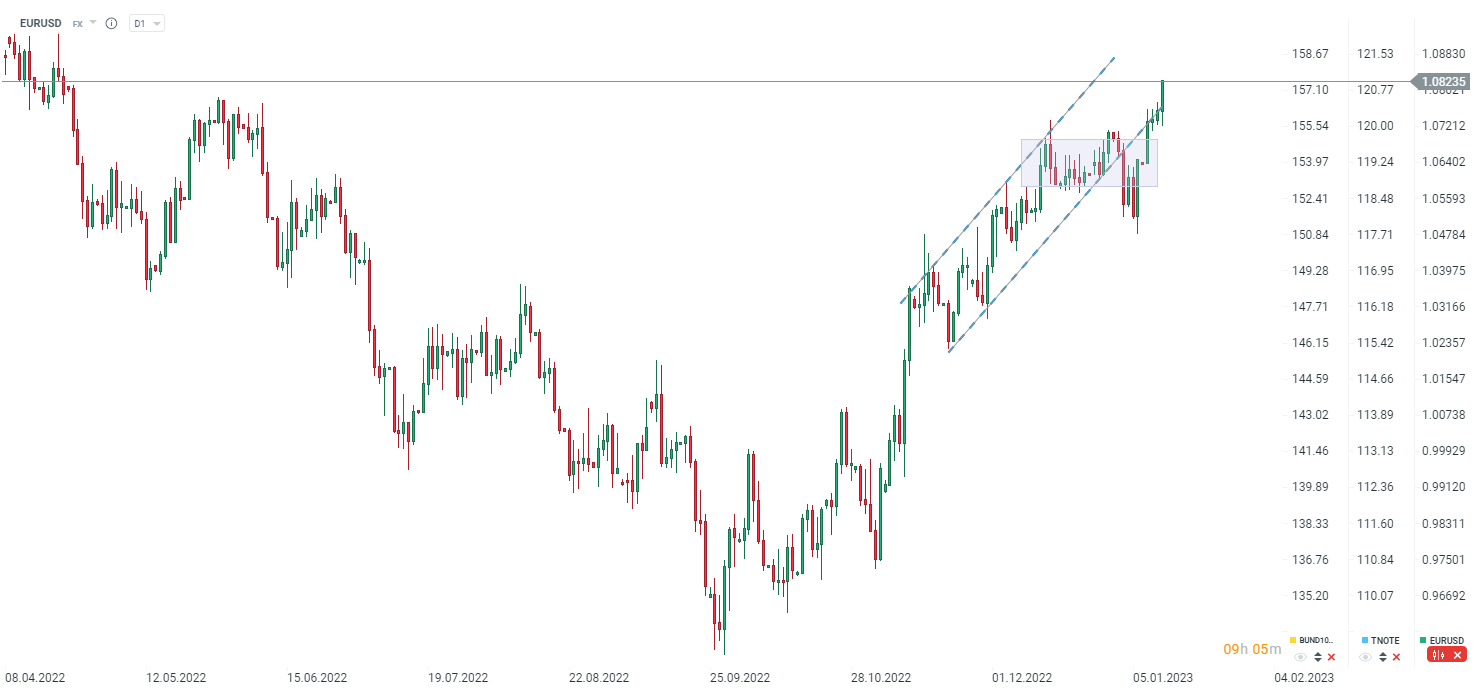 EURUSD przebija się przez 1,08 i jest notowany najwyżej od kwietnia. Źródło: xStation5