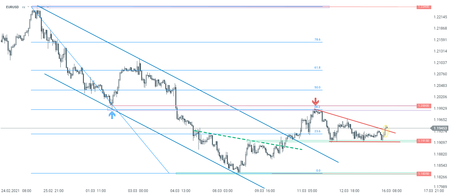 Patrząc na interwał H1, notowania zdołały w ostatnim czasie opuścić kanał spadkowy, jednak rynkowe byki nie były w stanie pokonać oporu przy okrągłym poziomie 1,20 USD, który wynika z mierzenia 38,2% Fibonacciego oraz wcześniejszych dołków z początku marca. Obszar zaznaczony kolorem fioletowym pozostaje kluczową zaporą w średnim terminie. Patrząc jednak na wykres w krótszym horyzoncie czasowym - notowania wybijają się właśnie górą z formacji trójkąta, co może przemawiać za ponownym atakiem na wspomniany opór. Z kolei aby myśleć o większysch spadkach, kurs musiałby cofnąć się poniżej poziomu 1,1915, wtedy też droga w kierunku ostatnich minimów przy 1,1835 zostałaby otwarta.