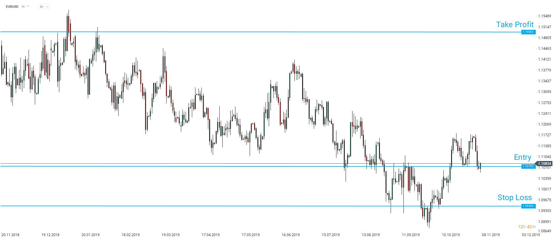Soceiete Generale rekomenduje zajęcie długiej pozycji na EURUSD po cenie rynkowej z celem przy 1,1500 i zleceniem stop loss ustawionym przy 1,0950. Źródło: xStation5