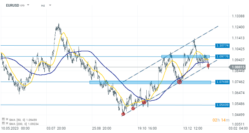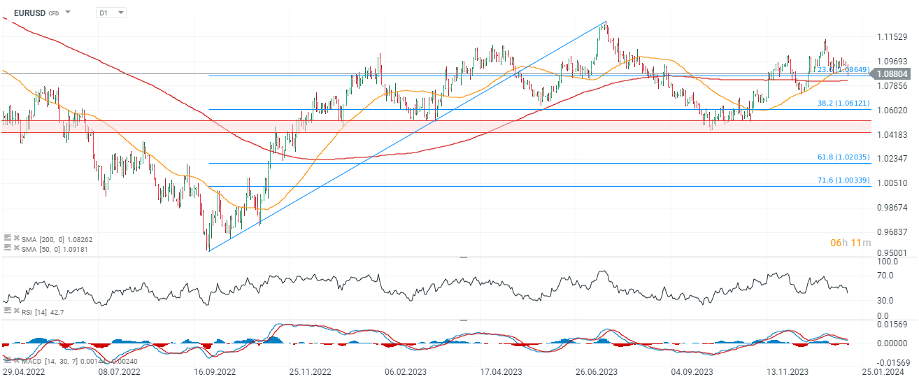 Ogólny wydźwięk wypowiedzi Wallera nie jest bardzo jastrzębi, ale zdecydowanie nie wspiera ‘gołębich’ oczekiwań wobec 2024, które utrwaliły się w ostatnich miesiącach na Wall Street. Waller sugeruje raczej metodyczne cięcia, z którymi Fed nie będzie się przesadnie spieszył. W efekcie widzimy aprecjację dolara i presję spadkową na EURUSD, które notuje prawie przeszło 0,5% spadek.