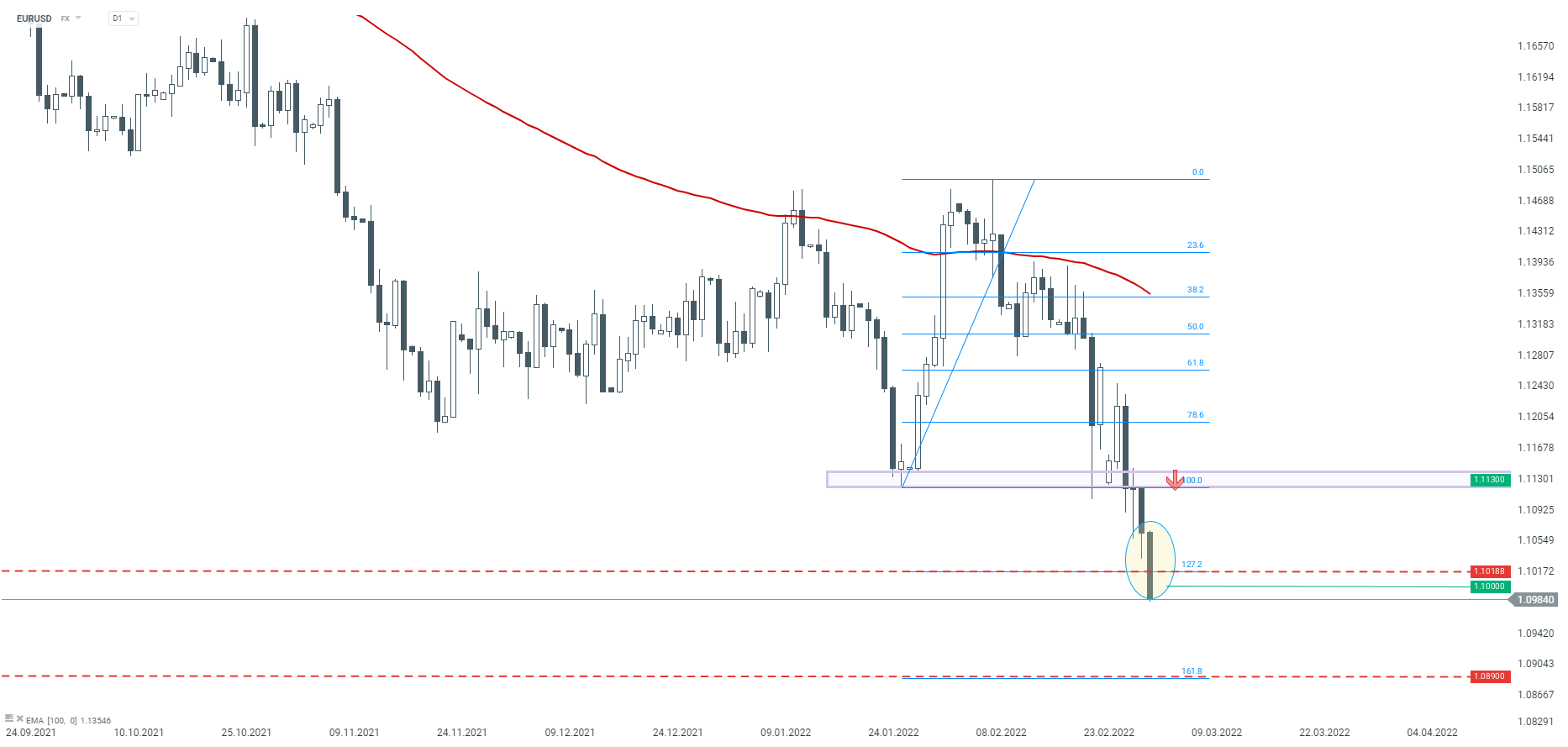 Po nocnej eskalacji konfliktu zbrojnego na Ukrainie na rynku utrzymuje się sentyment risk - off. Indeksy giełdowe znajdują się pod presją, a waluty uznawane za bezpieczne zyskują. Główna para walutowa spada poniżej okrągłego psychologicznego poziomu 1,10, co potwierdza długoterminowy trend spadkowy. Jeżeli obecny sentyment nie ulegnie zmianie, niewykluczony jest atak na poziome 1,0890, gdzie wypada mierzenie zewnętrzne 161,8%, wyznaczone z ostatniej korekty wzrostowej.
