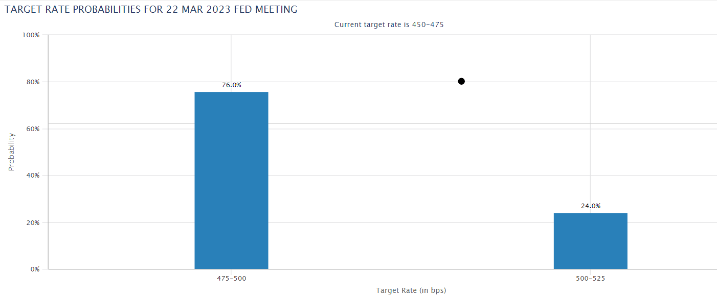 Rynek wycenia obecnie wyższą, 50 pb podwyżkę stóp Fed w marcu z 24% prawdopodobieństwem. Źródło: CME