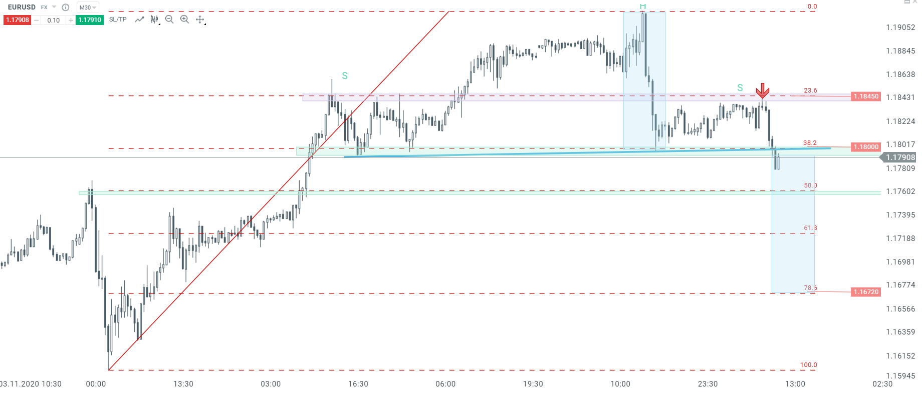 Podczas dzisiejszej sesji obserwujemy spadki na EURUSD. Patrząc na interwał M30, notowania wybiły dołem ważne wsparcie przy poziomie 1,1800, które wynikało z wcześniejszych reakcji ceny, jak i linii szyi układu głowy z ramionami. Zgodnie z klasycznymi założeniami analizy technicznej, złamanie tego wsparcia oznacza, że w krótkim terminie należy oczekiwać dalszych spadków. Potencjalny zasięg struktury RGR został zaznaczony niebieskimi prostokątami. Opublikowany dziś gorszy od oczekiwań indeks nastrojów ekonomicznych ZEW dodatkowo przyczynia się do słabości euro.