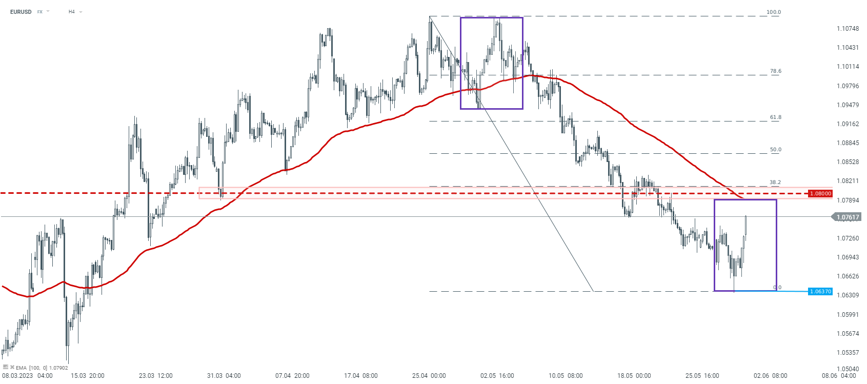 Patrząc z kolei na niższy przedział czasowy - H4, należy zwrócić uwagę na strefę oporu rozciągającą się w rejonach okrągłego poziomu 1,08 USD. Obszar zaznaczony kolorem czerwonym wynika z wcześniejszy reakcji ceny, średniej EMA100, mierzenia 38,2% Fibonacciego oraz górnego ograniczenia układu 1:1. W przypadku odbicia od wspomnianej strefy, niewykluczone będzie wznowienie ruchu spadkowego. Z drugiej storny, jej przekroczenie może zwiastować powrót do głównej tendencji - wzrostowej.