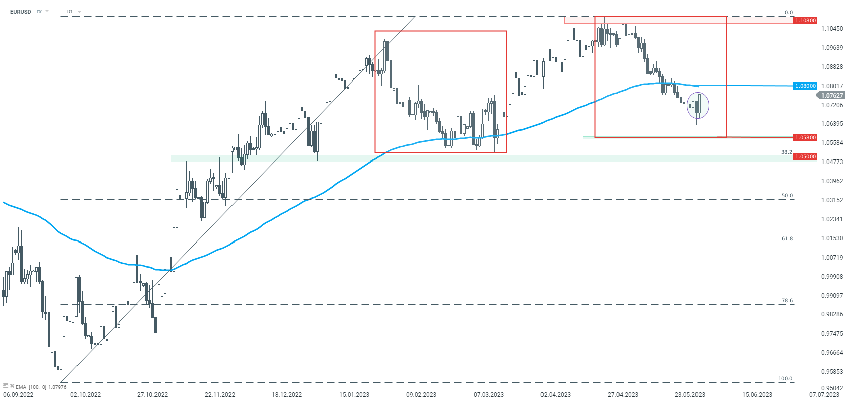 Patrząc na wykres EURUSD, w przypadku utrzymania obecnego sentymentu do końca dnia, na interwale D1 pojawi się pro wzrostowa formacja objęcia hossy, co mołoby oznaczać zakończenie korekty spadkowej, trwającej od początku maja. Jeśli chodzi o sytuację techniczną, ta w długim terminie cały czas wygląda korzystnie dla kupujących. Wydaje się, że dopiero przebicie poniżej poziomu 1,0500 byłoby oznaką zmiany trendu na EURUSD.