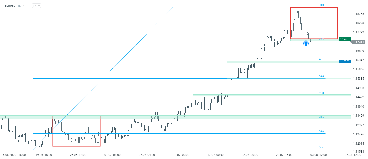 Patrząc technicznie na wykres H4, notowania ponownie testują kluczowe wsparcie przy 1,1745. Poziom ten wynika z dolnego ograniczenia układu 1:1, który jest największą korektą w całym ruchu wzrostowym, trwającym od 19 czerwca oraz mierzenia 23,6% Fibonacciego. Zgodnie z metodologią Overbalance, jeśli kupujący zdołają powstrzymać przecenę i dojdzie tutaj do wygenerowania sygnału popytowego - niewykluczony będzie ruch w kierunku zeszłotygodniowych maksimów. W przeciwnym razie, wybicie poziomu dołem, będzie oznaczało zmianę krótkoterminowej tendencji na spadkową. Wtedy też istnieje ryzyko spadków w kierunku1,1630, gdzie znajduje się mierzenie 38,2% Fibonacciego. Kolejne poziomy wsparcia również wynikaja z mierzeń Fibonacciego, są one także wzmocnione przez wcześniejsze reakcje cenowe.