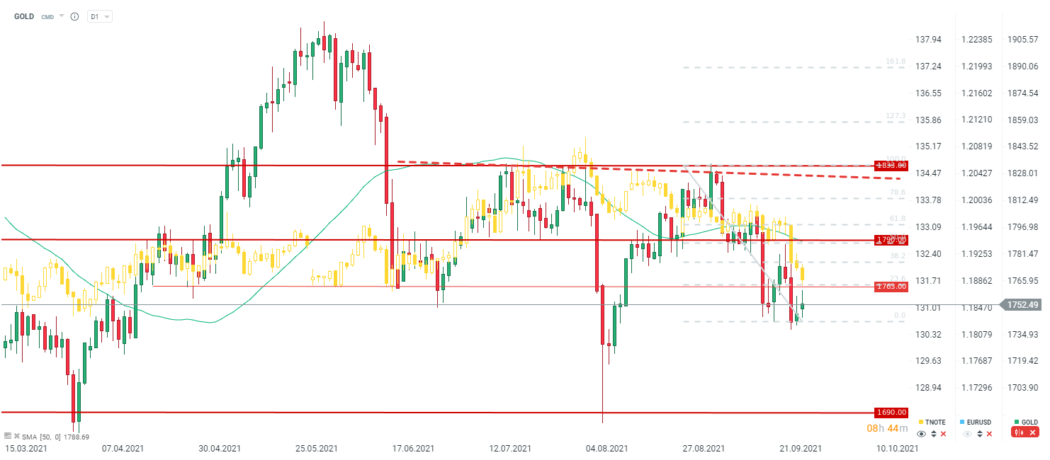 Spora zmienność ma dzisiaj miejsce na amerykańskich rentownościach. Przez moment obserwowaliśmy ruch nawet powyżej poziomu 1,5%, choć obecnie minimalnie ten ruch jest zneutralizowany. To pozwoliło na powrót złota powyżej 1750 USD za uncję.