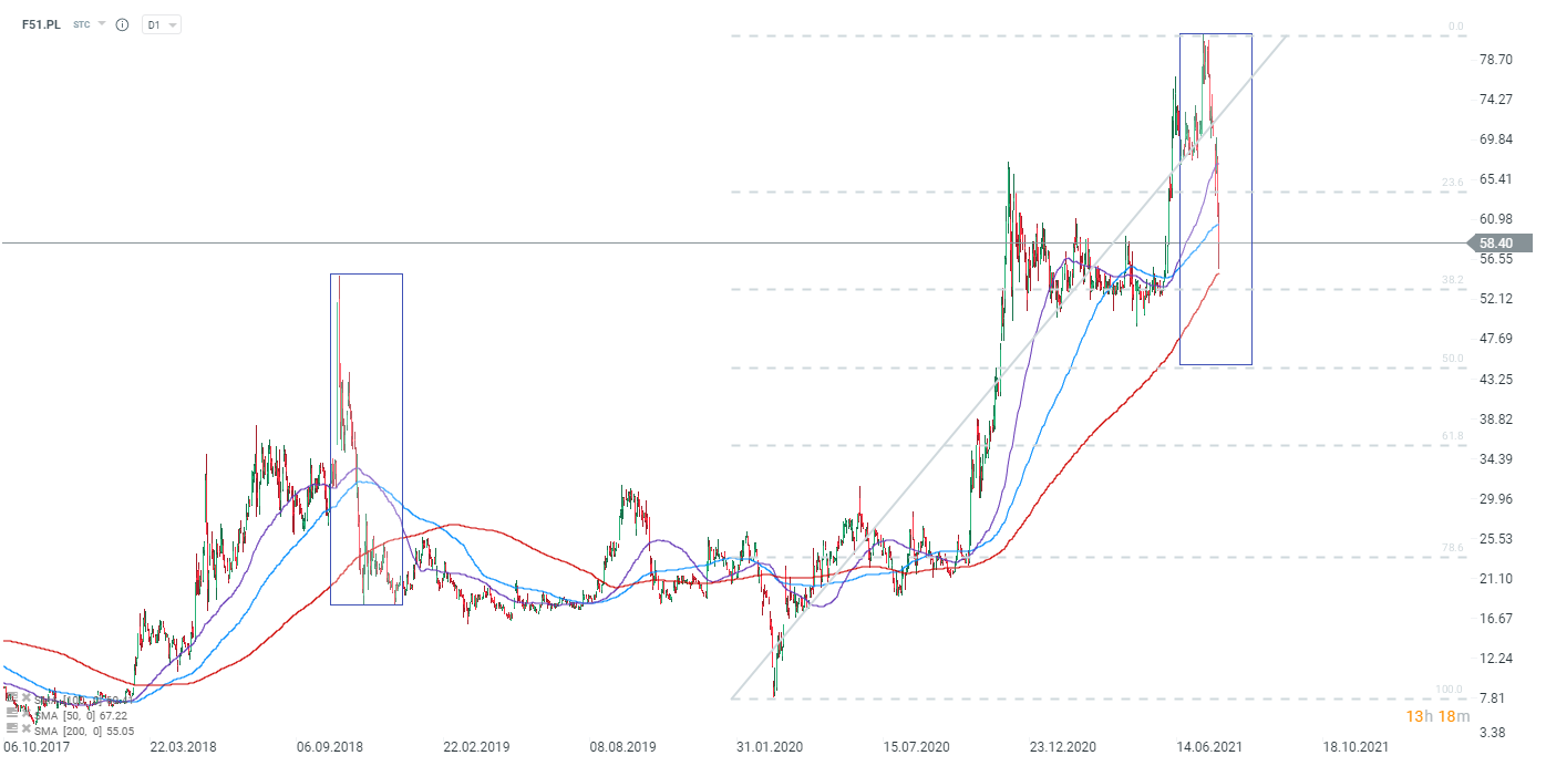 Akcje spółki spadły poniżej 60 zł, jednak po dotarciu w okolice 200 sesyjnej średniej rozpoczęły lekkie odbicie. W okolicach średniej oraz zniesienia 38.2 całej fali wzrostowej rozpoczętej w trakcie początku pandemii znajduje się „środek” konsolidacji cenowej. Wobec tego można oczekiwać, że w okolicach poziomu 52-54 zł znajduje się wyraźny popyt. Jednocześnie widać jednak, że akcje spółki zaliczyły w historii większą korektę niż ta obecnie. Zakres korekty z 2018 roku wynosił niemal 37 zł. Jeśli teraz korekta miałaby być podobna, celem spadków były okolice poziomu 45 zł.