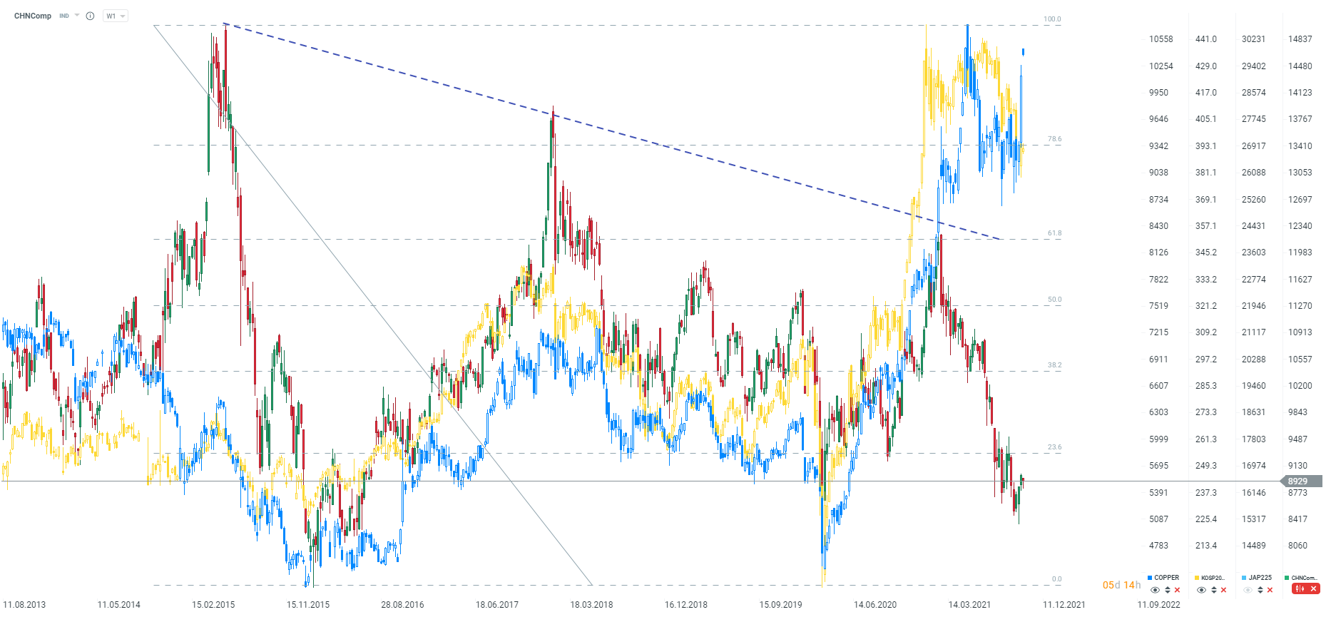 Chińskie akcje próbowały odbicia w ostatnim czasie. Dzisiejsze słabe dane doprowadziły do lekkich spadków. Z drugiej strony patrząc na zachowania takich rynków jak miedź czy koreański KOSPI, wydaje się, że chińskie akcje są mocno niedowartościowane. Kluczowym czynnikiem jest ograniczenie ryzyka, co może być również po części rozwiązane poprzez obniżkę stóp procentowych. Z drugiej strony polityka Chin na ten moment nie jest nastawiona na rynek, a na obywateli. Źródło: xStation5