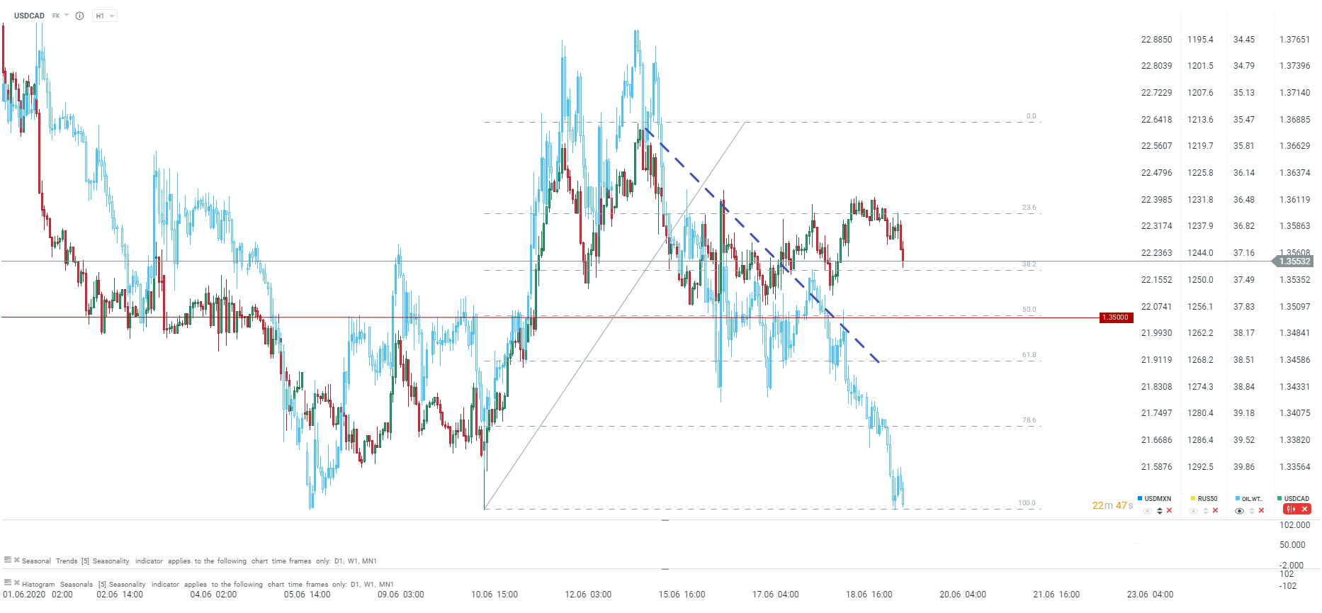 USDCAD dalej traci, pomimo słabych danych. Niemniej przed parą wsparcie w postaci zniesienia 38.2. Źródło: xStation5