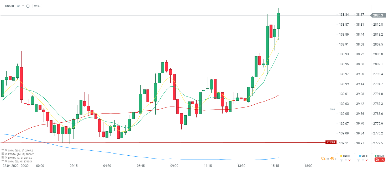 Mimo tego, na S&P 500 obserwujemy kontynuację wzrostów. Po kolejnym słabym odczycie claimsów, S&P 500 powędrował ok. 20 punktów wyżej i znajduje się wyraźnie powyżej 2800 punktów.