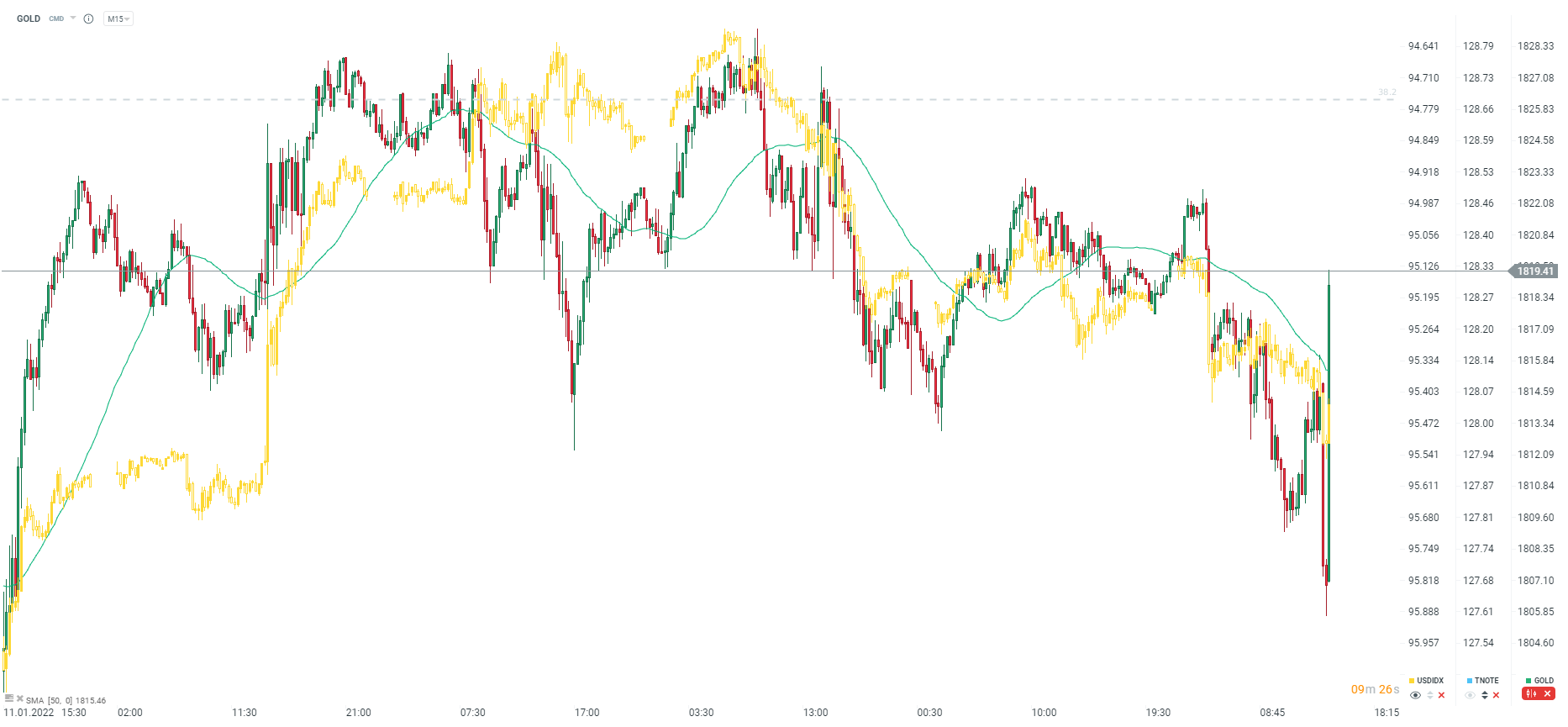 Złoto reaguje dosyć gwałtownie, co może być powiązane ze słabymi danymi z USA, które mogą podważać oczekiwane agresywne zacieśnianie polityki monetarnej. Z drugiej strony nie widać dużej reakcji na dolarze. Źródło: xStation5