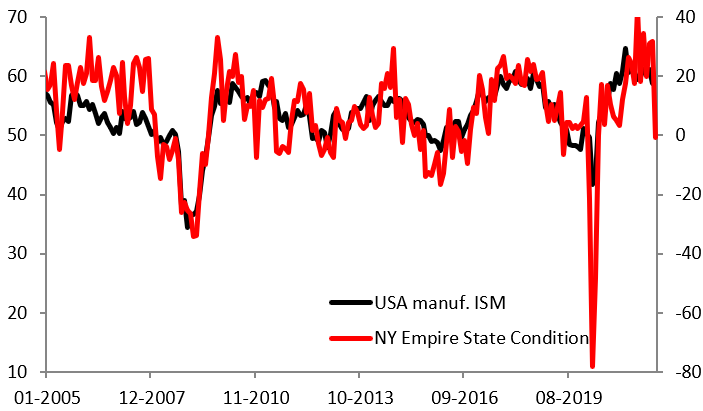 NY Empire wyraźnie spada i znajduje się najniżej od momentu odbicia po początkowym uderzeniu pandemii. Widać mocne spowolnienie w regionie Nowego Jorku, co może źle wróżyć odczytom dla całych Stanów Zjednoczonych. Źródło: Macrobond, XTB