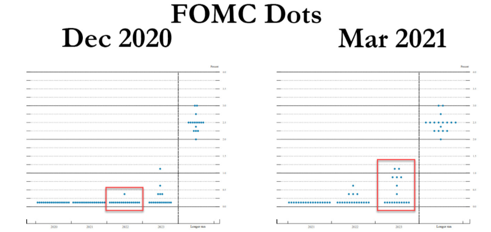 Widać lekką zmianę pod względem projekcji iinflacyjnych. Mediany stóp bez zmian. Widać jednak, że część bankierów widzi potencjał podwyżek już w 2022 roku. Źródło: Fed