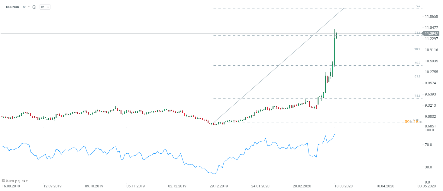 NOK ma za sobą kilka fatalnych sesji. Przez ostatnie dwa dni USDNOK wzrósł nawet o 15%! To przeogromna zmienność patrząc na rynek walutowy. Źródło: xStation5