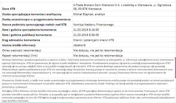 Zgodnie z rynkowymi oczekiwaniami Rezerwa Federalna utrzymała poziom stóp procentowych oraz zakomunikowała koniec cyklu zacieśniania polityki monetarnej. „Kropki” na tzw. „dot-charcie” pokazały, że bankierzy nie widzą już żadnej podwyżki w tym roku (w grudniu były to 2) oraz jeden ruch w kolejnym roku. Jest to dla rynków gołębie zaskoczenie, mimo tego, że rynek wyceniał już wcześniej szanse na cięcie stóp procentowych. Rynki oczywiście przereagowują i tak jest również w tym momencie, gdyż rynek widzi już 40% prawdopodobieństwo cięcia na koniec tego roku. Naszym zdaniem sygnalizacja podwyżki na 2020 obecnie wydaje się być nierealnym pomysłem, zwłaszcza jeśli Fed nie zdecyduje się na żaden ruch w drugiej połowie tego roku. Nowe projekcje PKB pokazują obniżoną ścieżkę wzrostu: 2,1% wobec 2,3% dla bieżącego roku oraz 1,9% wobec 2,0% dla roku następnego. W przypadku inflacji PCE mamy do czynienia z nieznacznym dostosowaniem w dół. Z kolei inflacja bazowa PCE pozostała bez zmian. W oświadczeniu Fed wskazał, że zamierza spowolnić redukcję swojego bilansu od maja – miesięcznie redukcja bilansu zostanie zmniejszona do 15 mld USD z poziomu 30 mld USD. Potem Fed planuje redukować bilans jeszcze do września i wtedy zamierza zakończyć proces „zacieśniania ilościowego”. Z kolei od października Fed będzie rolował dług wyemitowany przez agencje rządowe USA oraz tzw. MBS. Instrumenty te będą wymieniane na dług rządowy z limitem na poziomie 20 mld USD.