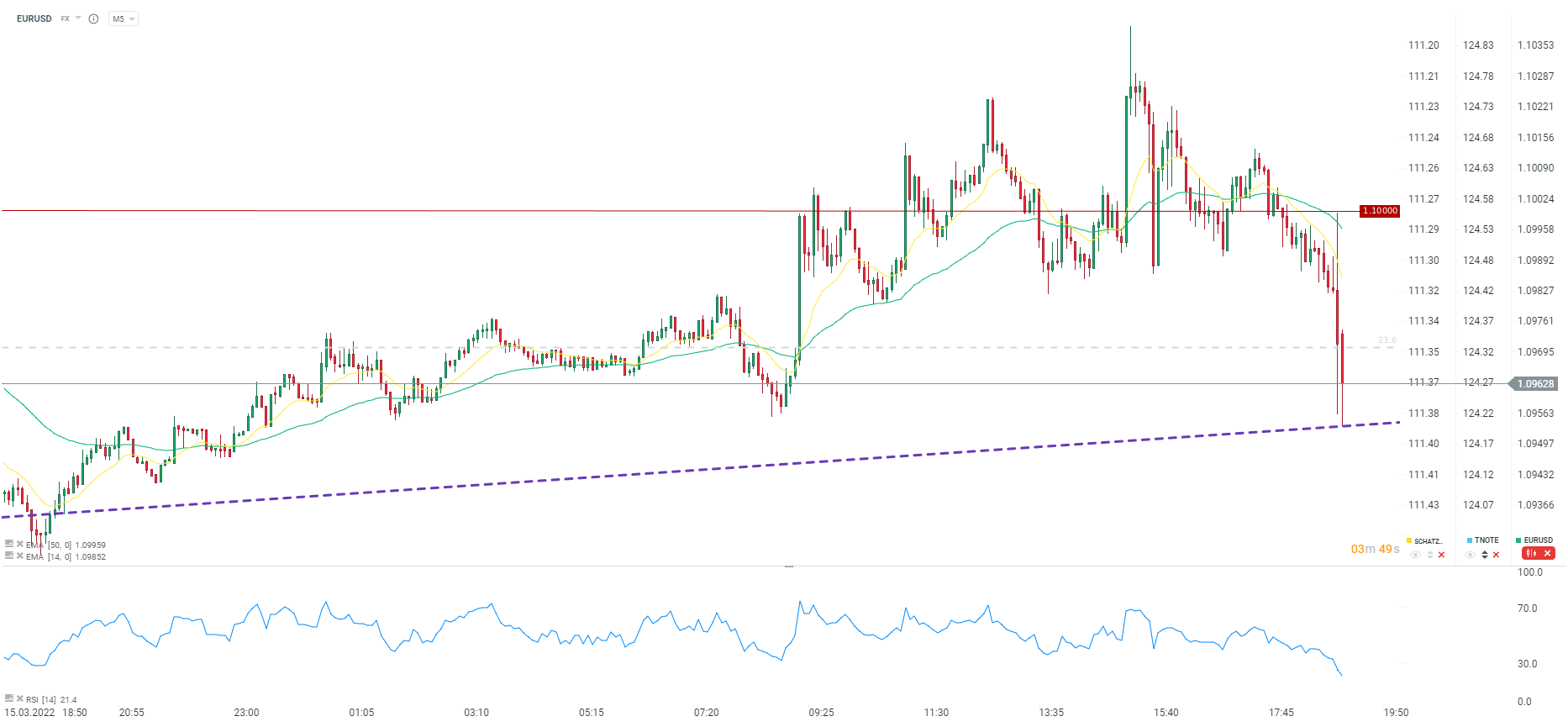 Sytuacja na dolarze amerykańskim jest bardzo dynamiczna. Para początkowa odbiła z okolic poziomu 1,0950, ale po kilku minutach wraca do tego poziomu. S&P 500 traci, złoto próbuje odbijać. Ruchy nie są jednak bardzo duże, gdyż Fed przygotowywał rynek na taki scenariusz od dłuższego czasu. Niemniej niektórzy mogli wątpić, że Fed utrzyma ton w związku z wybuchem wojny w Ukrainie. Tak się jednak nie stało. Warto też zauważyć, że Fed wskazywał wcześniej na 5 potencjalnych ruchów, natomiast dostosowuje się pod rynek i widzi już teraz 7 podwyżek.