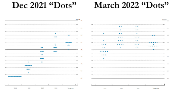 Widać po nowym dot plocie, że większość podwyżek powinna mieć miejsce w tym roku i cały proces ma zakończyć się w roku przyszłym. Oczywiście przy takiej inflacji rynek mógł oczekiwać, że perspektywy podwyżek znacząco się podwyższą, ale jednak w obliczu wojny, utrzymanie chęci agresywnych podwyżek wpływa na rynek. Dot chart zakłada podwyżkę na każdym posiedzeniu w tym roku. To oznacza, że stopy powinny w tym roku sięgnąć 2%. Źródło: Fed, ZeroHedge