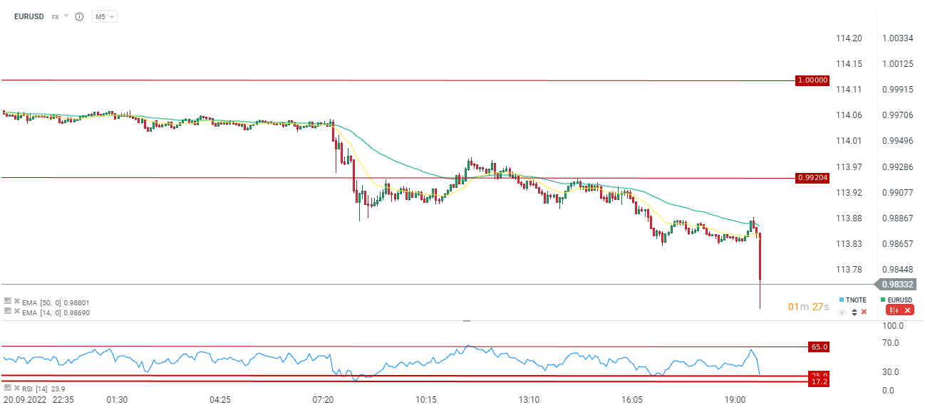 Mediana na 2023 na poziomie 4,6% oraz mediana na 2024 na poziomie 3,9%. Prognozy wyglądają bardzo jastrzębio i pokazują, że rynek może się mylić co do potencjalnych obniżek w przyszłym roku. Dolar wyraźnie zyskuje - nowe 20 letnie minima na EURUSD, S&P 500 w odwrocie.